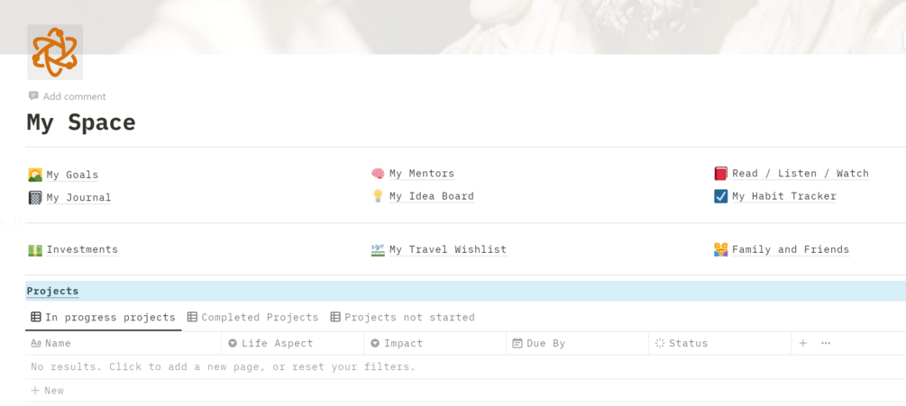 "My Space" is created using Notion. It is a simple digital organizer that helps you keep track of your Goals, Projects, Ideas, Travel plans, Investments, Relations, Habits etc. Its simplicity helps you focus on your stuff instead of focusing on the template itself.